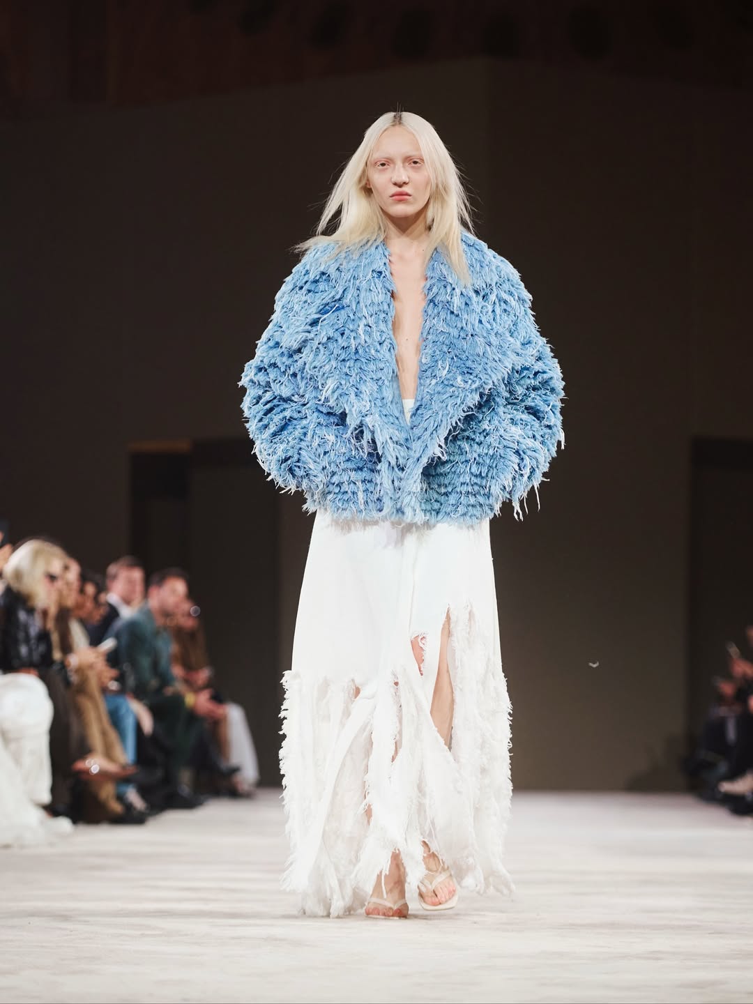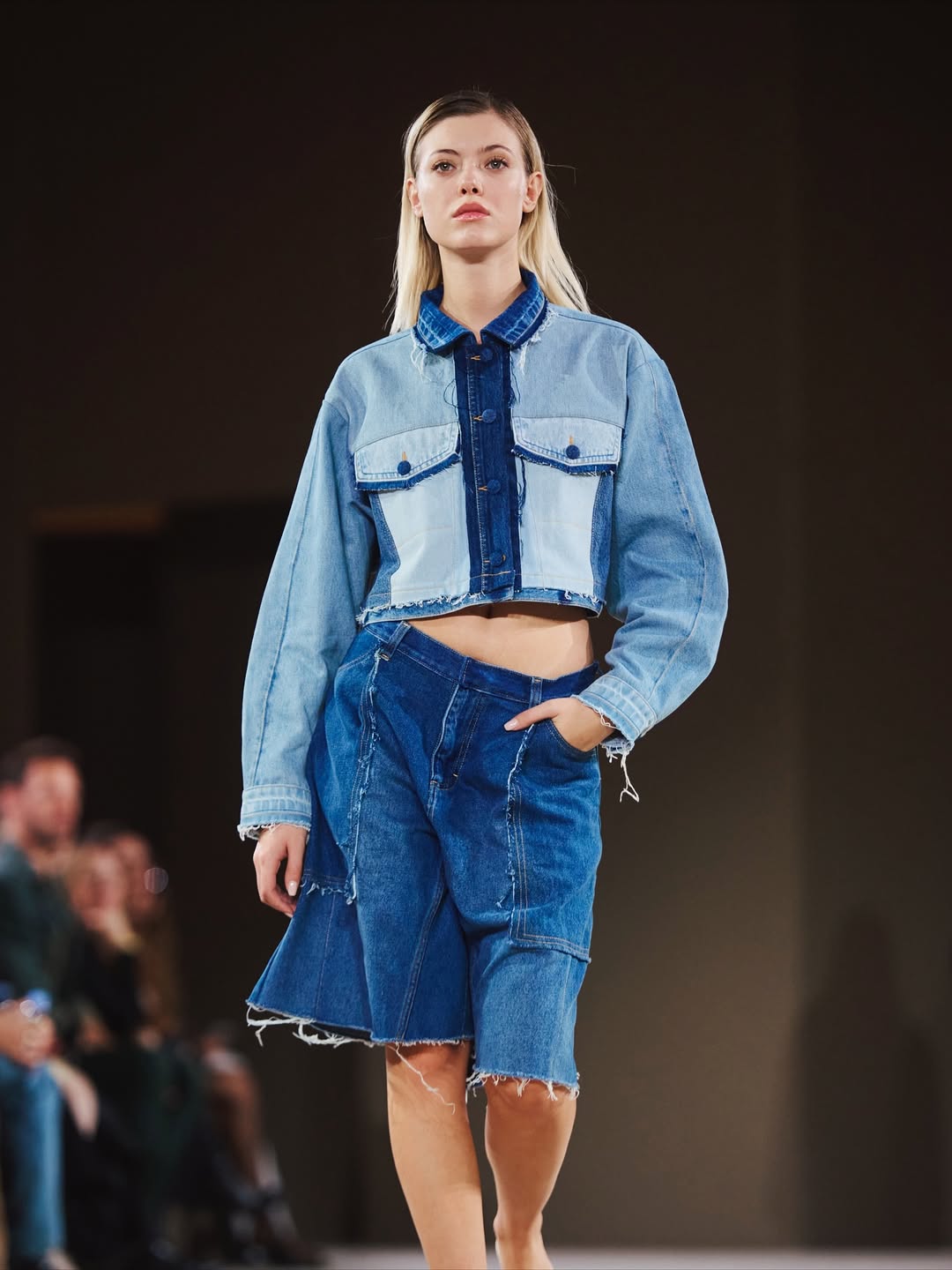 The result is a contemporary reimagining of denim, distinguished by exposed intertwining threads, distressed details, and intricate denim braiding—each piece a striking statement against the disposable nature of modern fashion.