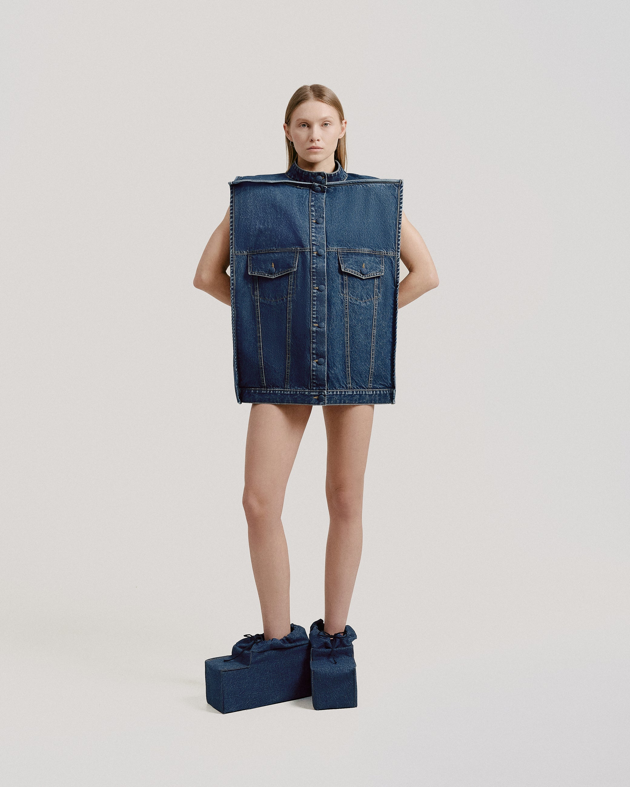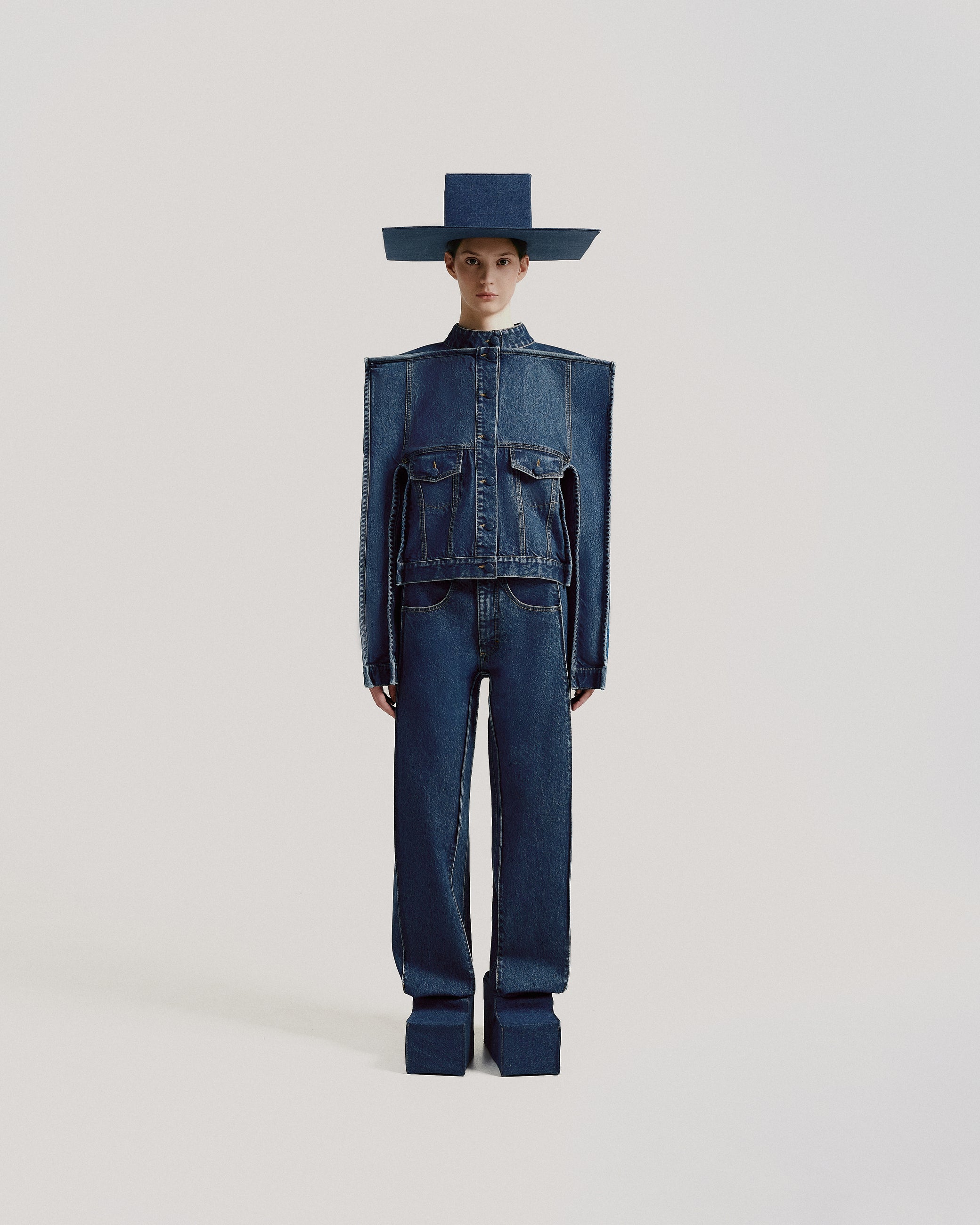 The result? Literal cubes. Jeans, jackets, t-shirts, and caps—all cut into rigid, geometric, box-shaped forms, as if they had been exported straight from a video game. It’s a playful, slightly absurd experiment that started as a joke but quickly turned into a full-fledged conceptual study.